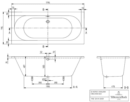 Villeroy & Boch O.novo Rectangular Acrylic Bath Tub Art. UBA180CAS2V-01