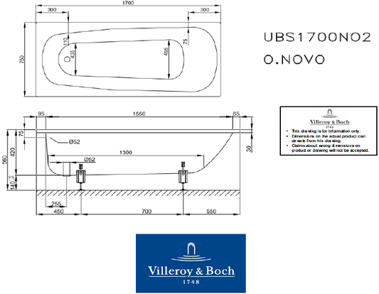 Villeroy & Boch O.novo Rectangular Steel Bathtub Art. UBS170OFN2V-01 1700 x 750mm
