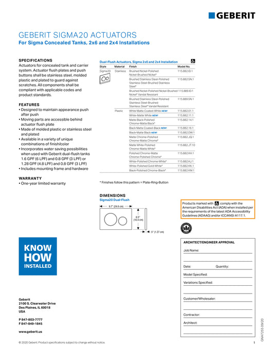 Geberit Sigma20 Flush Actuator Plate Art. 115.882.SN.1 (METAL MODEL)