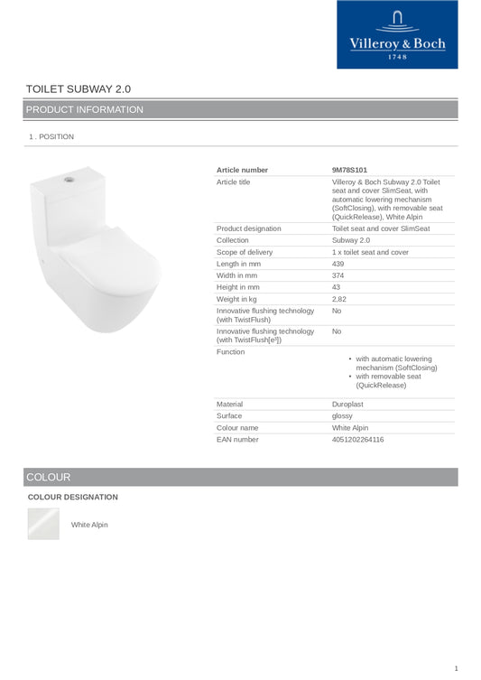 Villeroy & Boch Subway 1.0 Original Seat Cover Art. 9M55S101