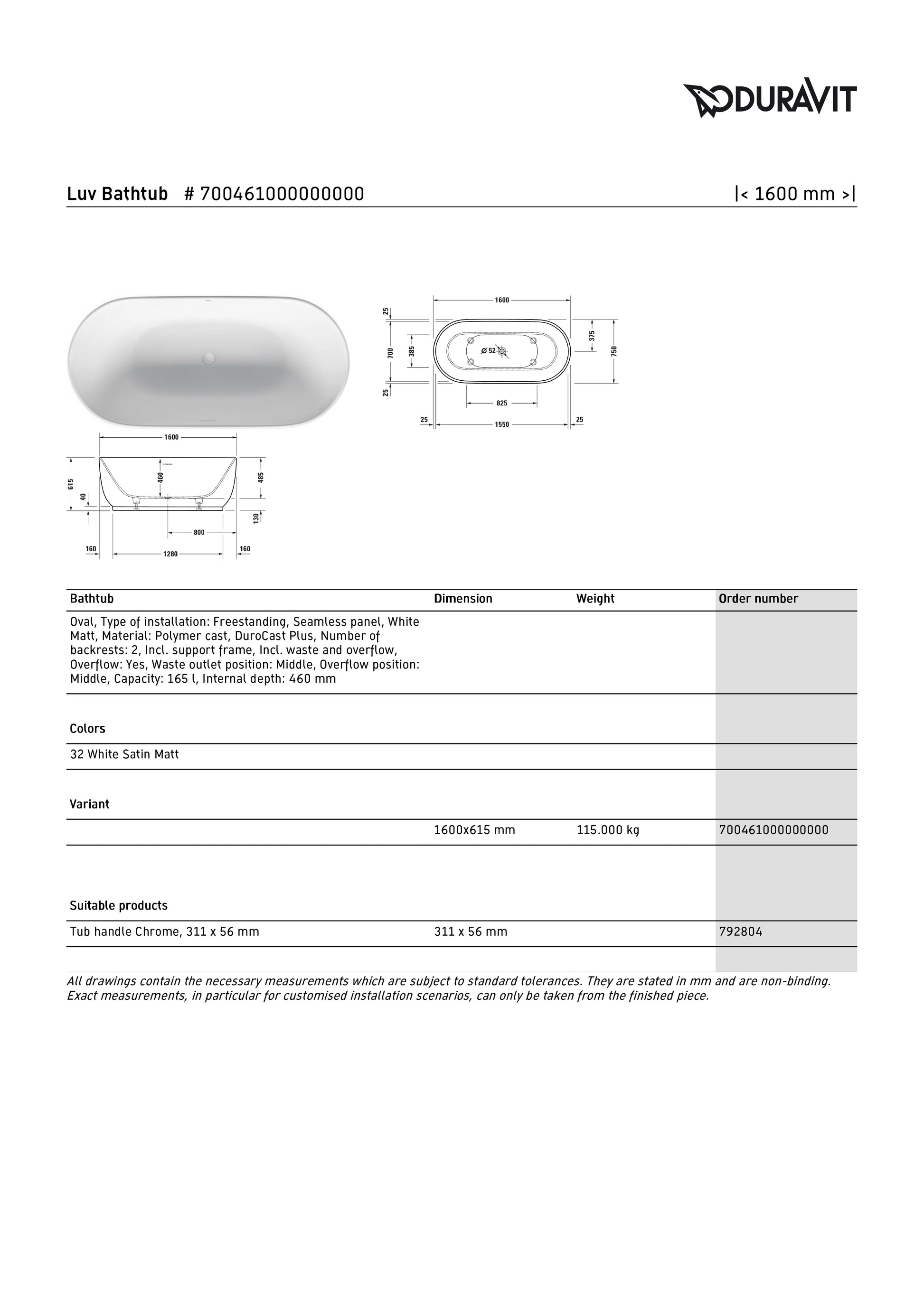 Duravit LUV Freestanding Bathtub Art. 700461000 1600 x 750mm