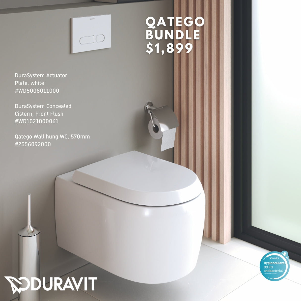 *QATEGO* *Hygiene Glaze* Duravit Qatego Wall Hung WC + Durasystem Cistern + Flush Plate (White)