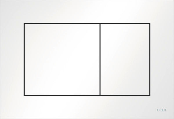 Flush plate for TECE cisterns, for front or top actuation. Very flat plastic flush plate, buttons with rubber inlays on both sides. Incl. actuating rods and mounting material. Suitable for flush-mounted installation in combination with toilet installation frame and spacing frame. Compatible with insert chute for cleaning tablets.