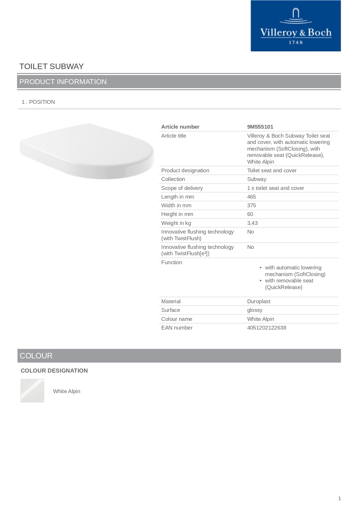 Villeroy & Boch Subway 1.0 Original Seat Cover Art. 9M55S101